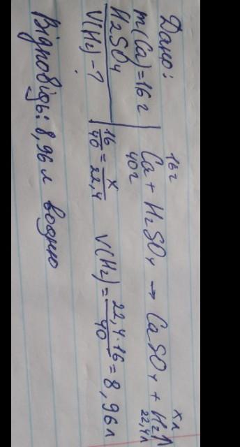 Який об’єм водню виділиться при взаємодії кальцію масою 16 г з сульфатною кислотою?