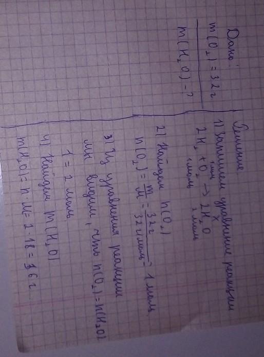 Какое количество вещества (моль) воды получится, если в реакцию с водородом вступило 32 граммов кислорода?