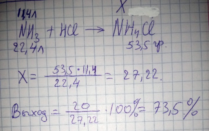 При взаимодействии 11, 4л аммиака NH3 с соляной кислотой HCL получили 20г NH4CL вычислите массовую долю выхода продукта реакции.